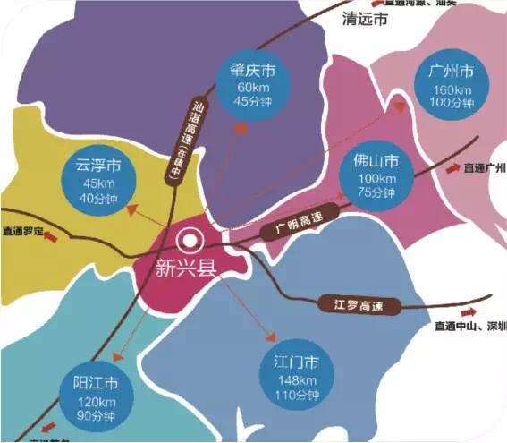 新兴受3+1(南深、广湛、江肇3高铁+1普铁)铁路线路带动,处于珠三角新干线机场辐射范围内,江罗高速、汕湛高速云湛段的全线贯通,陆空一体化交通枢纽逐渐完善,实现机场、高铁及高速的无缝衔接。