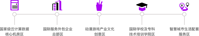 项目以“云计算信息产业集群”为核心定位,以打造“中国信息科技文化产业城”为远景目标,计划分为六大功能板块,即“五区一中心”。